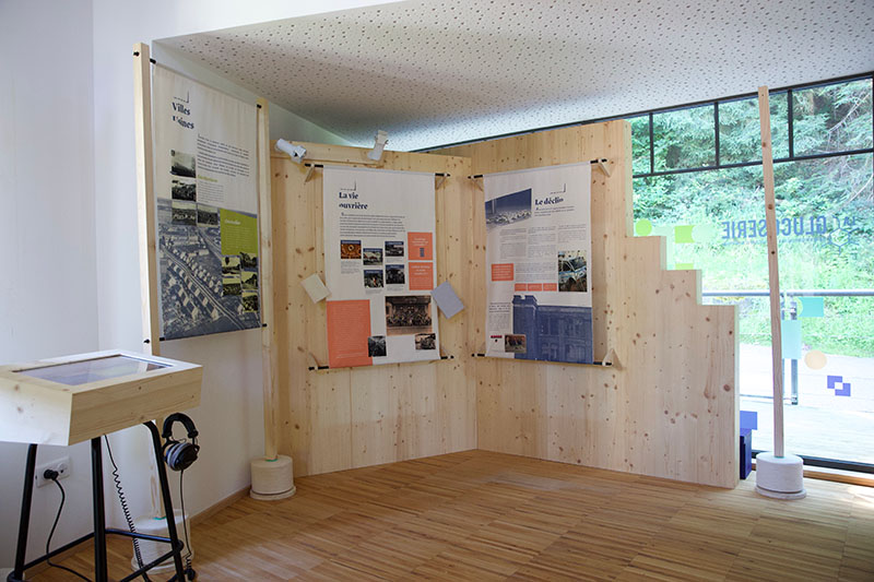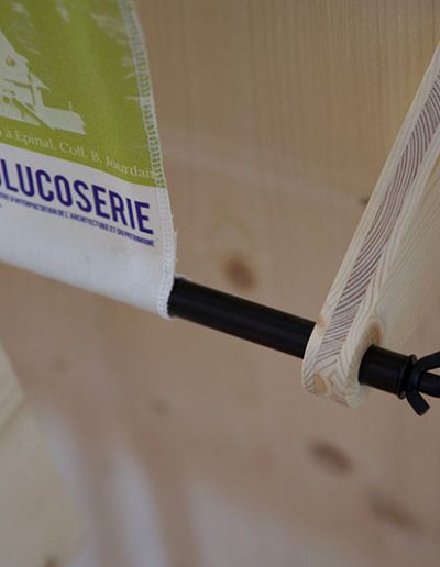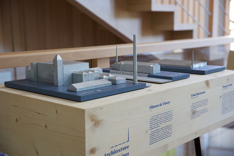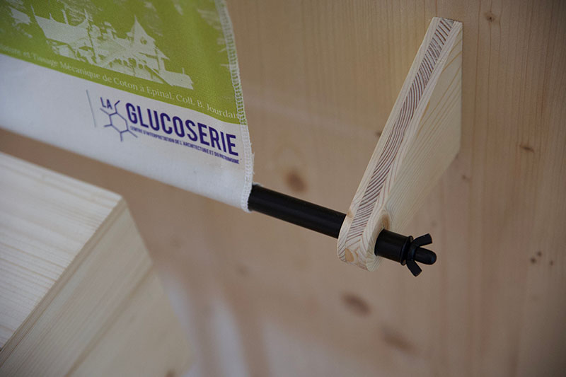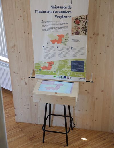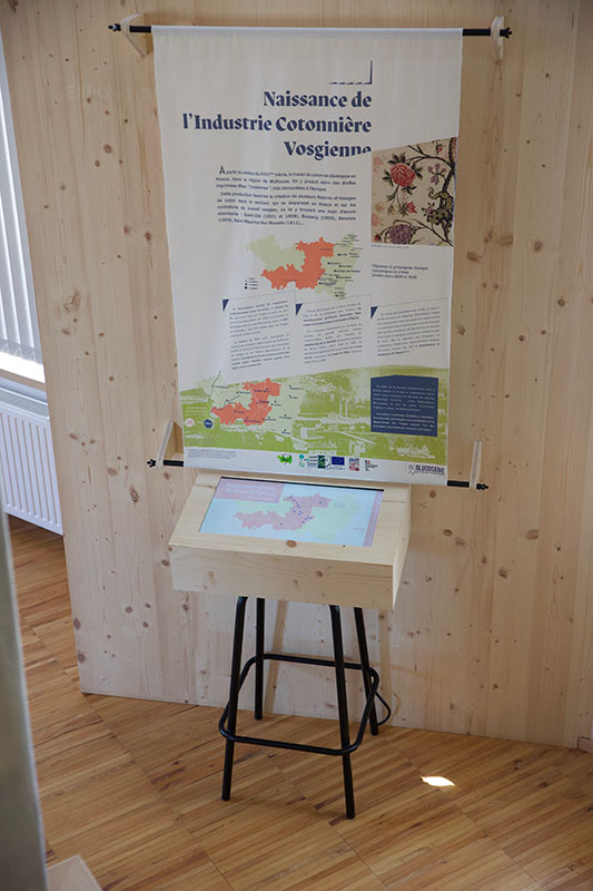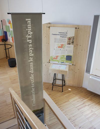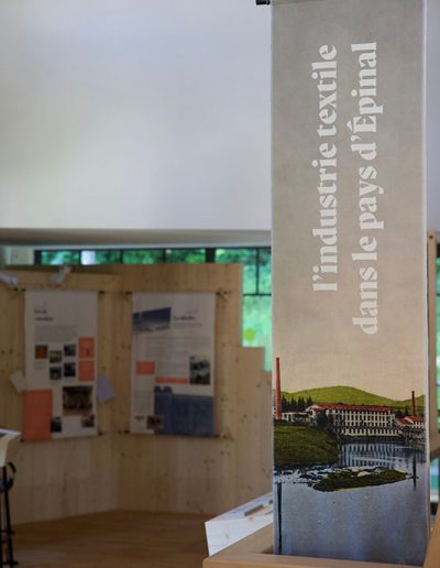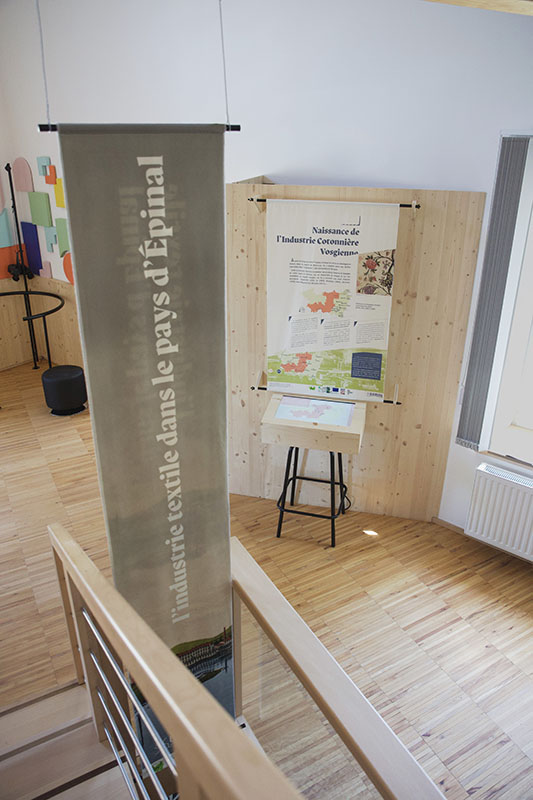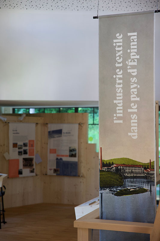 La scénographie est pensée par les matériaux du territoire : le bois et le tissu. Des matériaux de réemploi tel que des pieds d’anciens tabourets vont former la base des « pupitres ». Cette exposition est l’opportunité, de révéler la richesse du territoire du Pays d’Épinal Coeur des Vosges, en travaillant avec les ressources du territoire, matérielles et immatérielles. Ainsi, le processus de création mettra uniquement en oeuvre les ressources du territoire des Vosges, que ce soit les partenariats ou la matière (bois et tissu). Pendant la création de cette exposition, les entreprises de tissage, de blanchiment et d’impression de tissu (Crouvezier dev, Up’ textile, TMT) ont été visité et invité à l’inauguration pour créer des liens entre exposition et industrie actuelle.