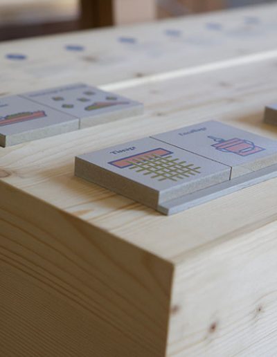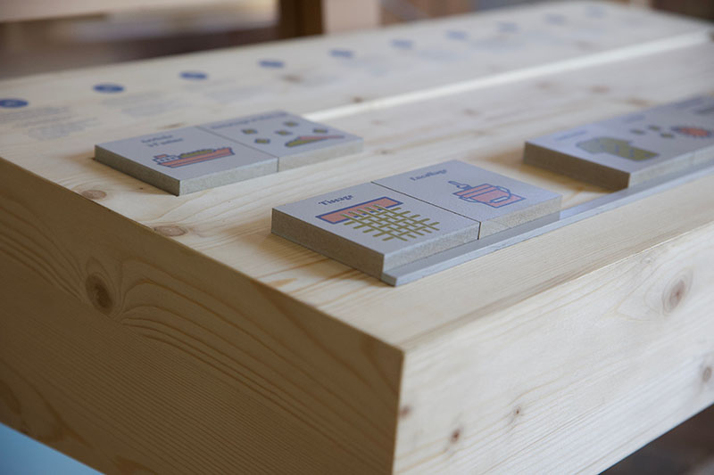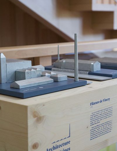 Deux familles d’objets archétypales ont été dessinées pour l’exposition : les pupitres et les cadres tissés. Les pupitres sont réalisés avec des piètements réemployés, peints en noir, assurant une unité esthétique et une manutention facile. Le câblage est caché dans le piétement tubulaire. Les éléments techniques (ordinateurs, tablettes, amplificateur, etc.) sont stockés dans les caissons en bois. Certains proposent un angle pour inviter l’usager à manipuler, interagir, toucher. D’autres caissons sont des éléments proposant un espace d’exposition pour les maquettes et également un rangement au moment de l’itinérance.