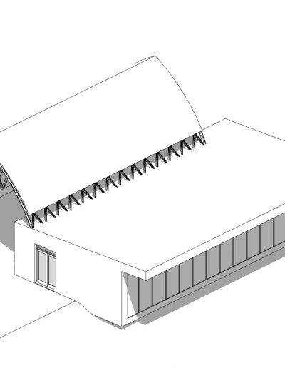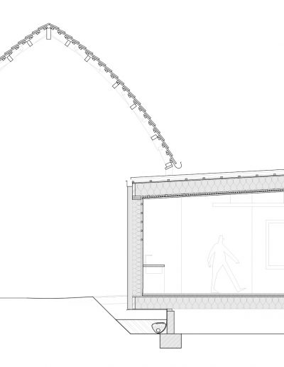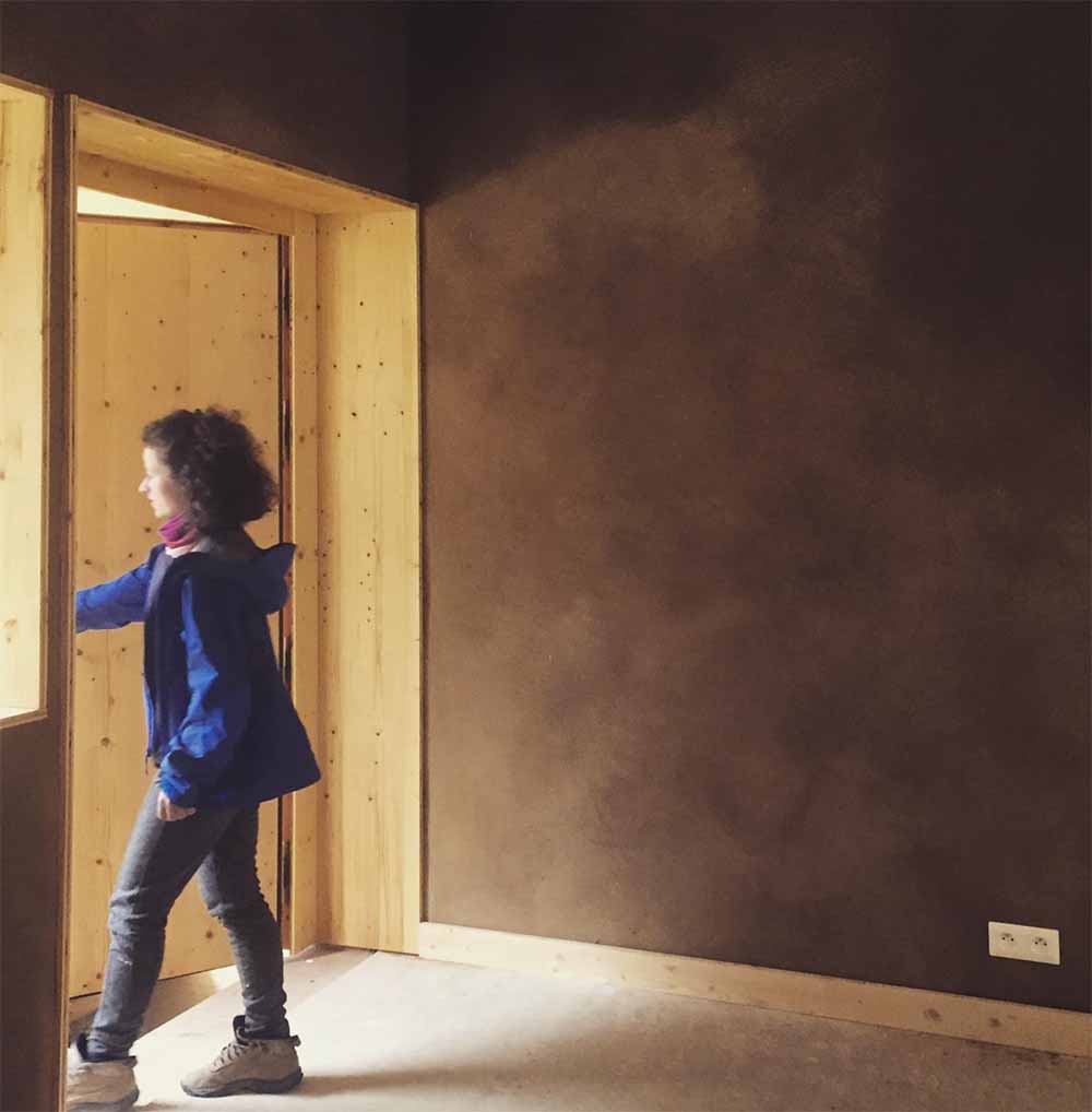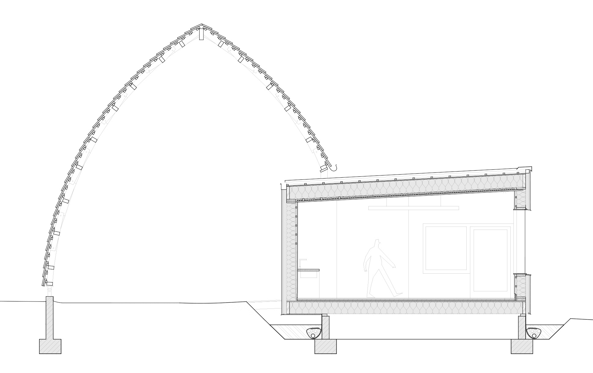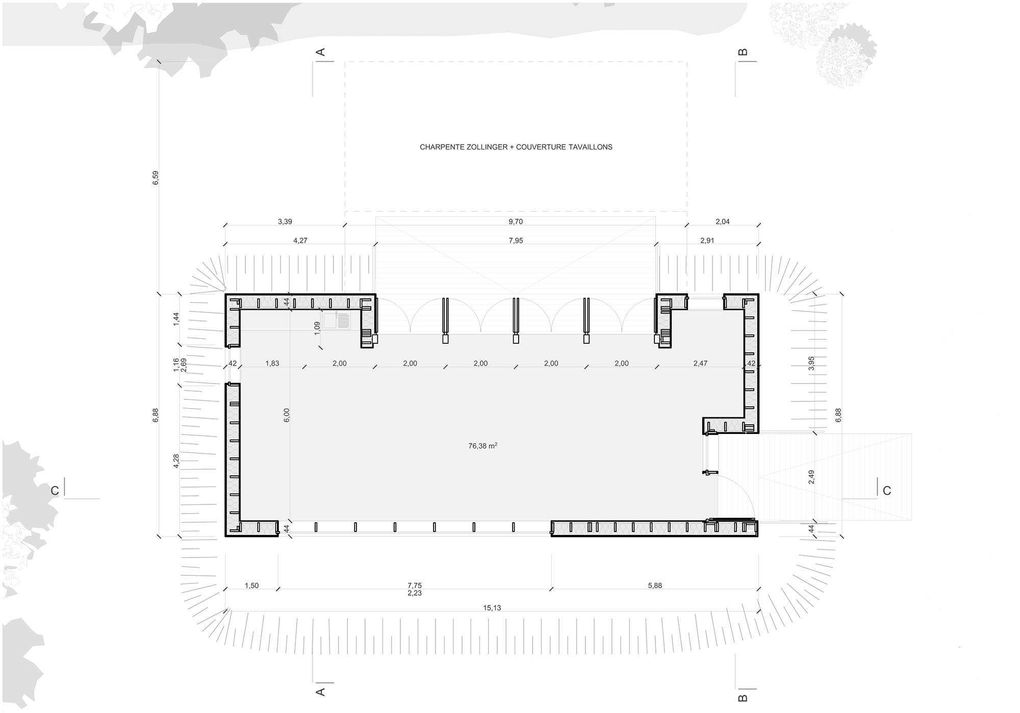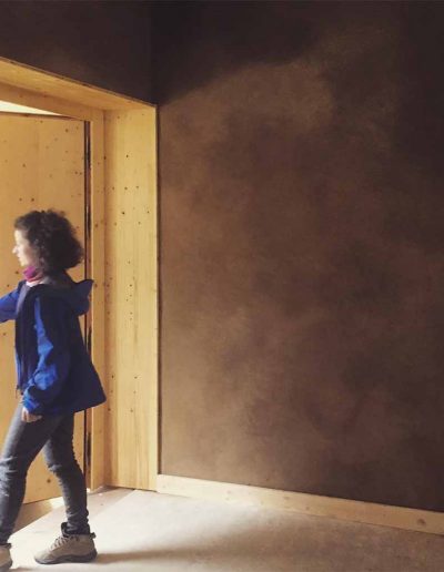 L’espace intérieur permet d’accueillir soixante personnes assises. Il est pensé pour recevoir des usages polyvalents: écouter une conférence, voir une exposition, organiser des activités, accueillir des événements festifs, etc. La charpente dite Zollinger accolée au nord devient le préau pour protéger des intempéries. Le pavillon s’ouvre au sud pour capter les rayons solaires d’hiver. Les fenêtres sont reculées par rapport au nu de la façade pour être protégées des rayons d’été. La terre, utilisé en enduit de corps et en finition, offre une inertie pour un meilleur déphasage thermique.