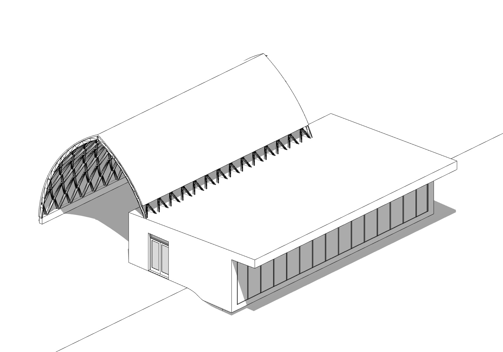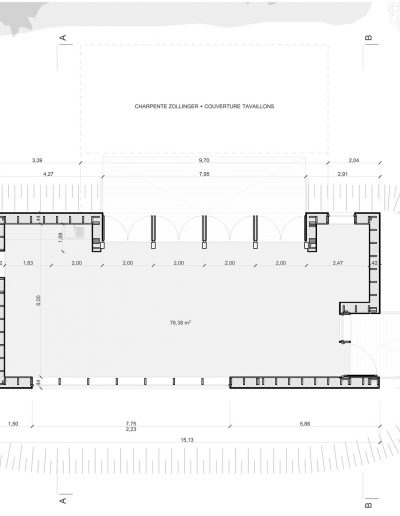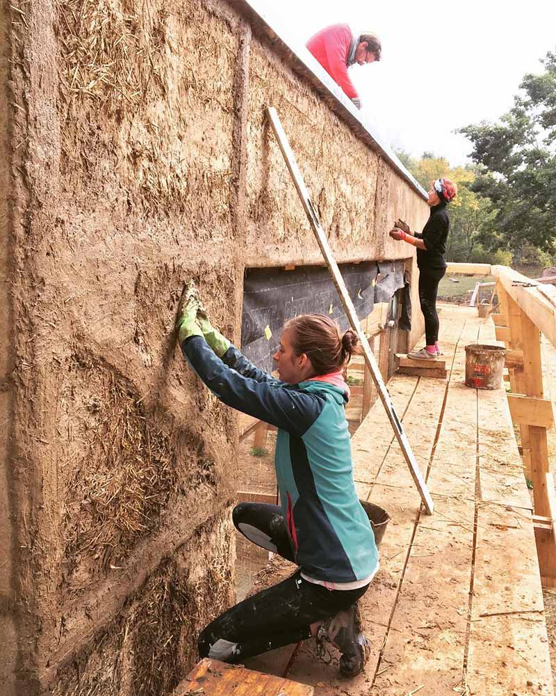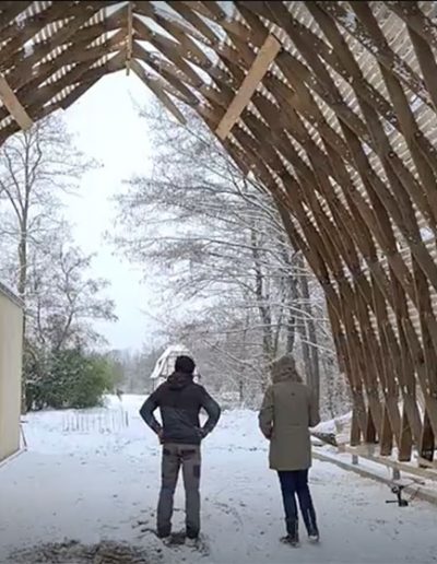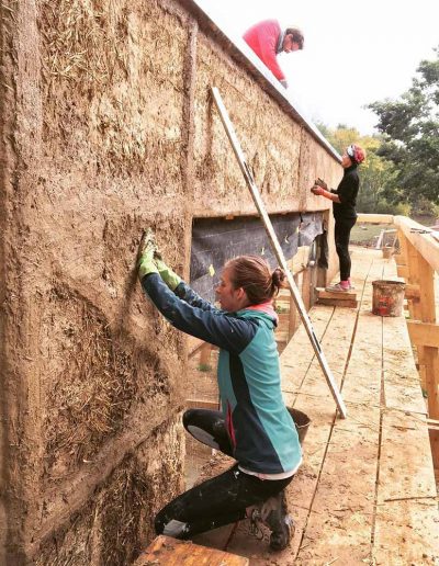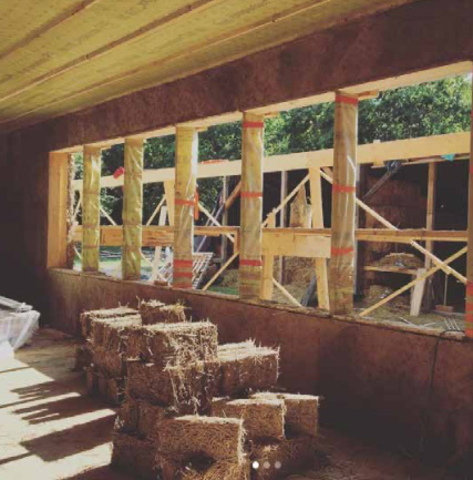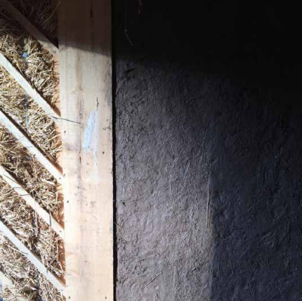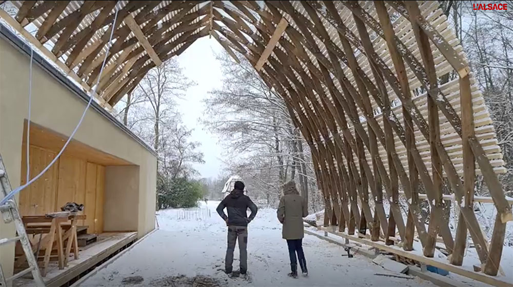 Le projet a été réalisé en chantier participatif pour sensibiliser aux savoir-faire locaux avec les entreprises locales du territoire rhénan. Dans le but de limiter l’énergie dépensée dans la construction du bâtiment, les matériaux proviennent de moins de 50km ; ils sont biosourcés, réemployés. Ainsi, le projet se targue d’une charpente singulière du début du XXe siècle, récupérée sur un chantier de démolition strasbourgeois. Des anciennes poutres de lamellé-collé d’un gymnase ont été redimensionner avec l’aide d’une scierie mobile pour former l’ossature en bois du pavillon. La terre utilisée pour les enduits provient de l’excavation d’un chantier riverain. Et la paille a été directement achetée chez l’agriculteur voisin. Ces éléments réemployés et de proximité, nous ont permis de construire un projet au bilan carbone faible. Cette architecture « du disponible » nécessite de penser le projet en fonction de la matière locale présente.